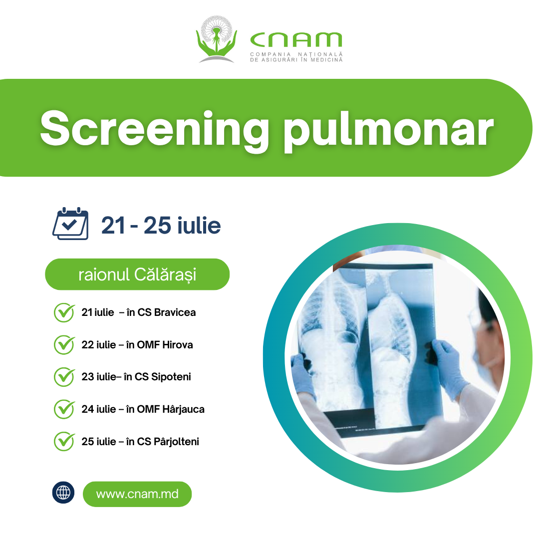 Astfel, săptămâna curentă, complexul radiodiagnostic mobil pentru examinarea cutiei toracice se va afla în diferite instituții din raionul Călărași, și anume: