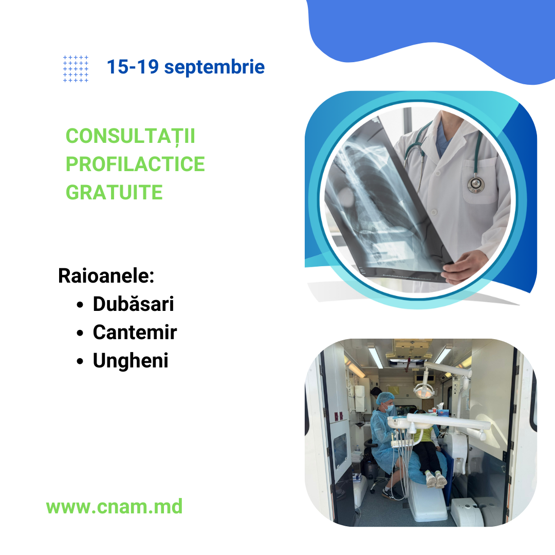 Echipele mobile de medici specialiști continuă să ofere populației consultații profilactice gratuite, acoperite din mijloacele financiare ale fondului măsurilor de profilaxie al Companiei Naționale de Asigurări în Medicină.