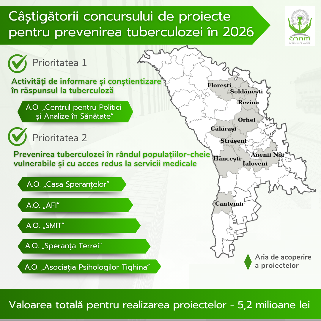 Comisia de selectare și evaluare a proiectelor finanțate din fondul măsurilor de profilaxie al Companiei Naționale de Asigurări în Medicină (CNAM) a desemnat câștigătorii concursului de proiecte privind activități de informare și conștientizare în răspunsul la tuberculoză și profilaxia și prevenirea tuberculozei (TB), desfășurat în perioada 13 ianuarie – 12 februarie 2026.