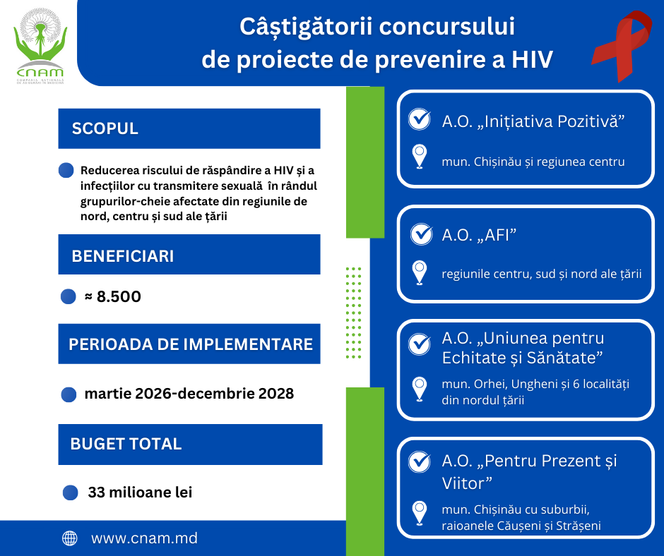 Comisia de selectare și evaluare a proiectelor finanțate din fondul măsurilor de profilaxie al Companiei Naționale de Asigurări în Medicină a desemnat câștigătorii concursului de proiecte multianuale de prevenire a HIV și reducere a riscurilor în rândul grupurilor-cheie afectate, desfășurat în perioada 13 ianuarie – 12 februarie 2026.